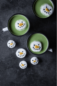 Let’s start with hot matcha latte, a recommended menu of many shops that adds color to the Christmas festival. It’s easy to eat by adding cute snowman marshmallows. The method is not difficult because we start by making square marshmallows according to the marshmallow recipe of the favorite shop. Make them large enough to cut into small rounds. Use a toothpick with one pointed end to break off and dip the toothpick into melted orange white chocolate and draw a nose on the marshmallow. For the eyes, put 2 tablespoons of dark chocolate chips and 1/4 teaspoon of coconut oil in a small plate and microwave in 20-second increments, stirring a little at a time, until the dark chocolate is completely melted and smooth. Use a pointed toothpick to dip into the melted dark chocolate and smear it on the snowman’s eyes and mouth. Let the snowman chocolate set at room temperature before serving with your favorite hot matcha latte.