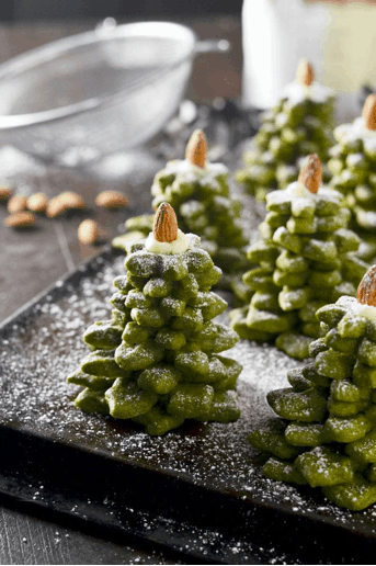 A technique to make Christmas cookies more cute is when pressing the dough into the shape of a Christmas tree. You can press it into the shape of stars of various sizes so that after baking, you can arrange them in alternating layers, with each layer connected with a little white chocolate. Stick the star on top with almonds and sprinkle a little icing. You’ve got a green tea cookie menu for this Christmas season.