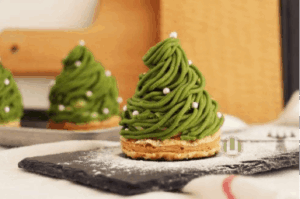 Another menu that just seeing it makes you think of a Christmas tree is Matcha Mont Blanc. You can use the regular Mont Blanc recipe, but just replace the chestnut cream on top with green tea cream and decorate with colorful icing cookies. It becomes a green tea Mont Blanc that will impress anyone who eats it.
